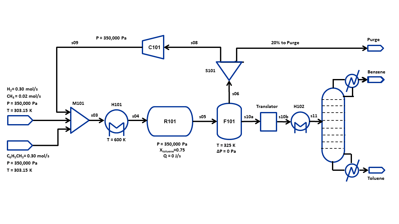 This tutorial will be similar to the HDA flowsheet tutorial in the Tutorials section, except that we use a distillation column instead of a second flash (F102) to produce benzene and toluene products.
