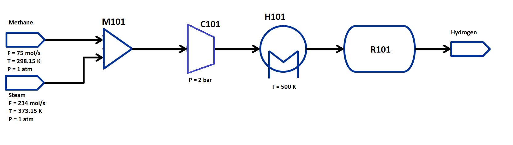 The flowsheet that we will be using for this module is shown below with the stream conditions. We will be processing natural gas and steam feeds of fixed composition to produce hydrogen. As shown in the flowsheet, the process consists of a mixer M101 for the two inlet streams, a compressor to compress the feed to the reaction pressure, a heater H101 to heat the feed to the reaction temperature, and a EquilibriumReactor unit R101. We will use thermodynamic properties from the Peng-Robinson equation of state for this flowsheet.